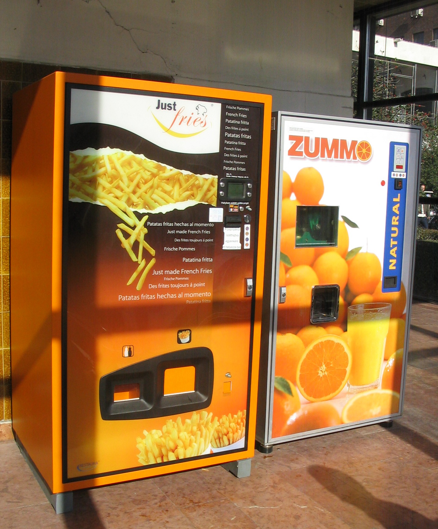 Our building has added two new machines. We have the usual coke, candy and coffee machines. I’ll say more on coffee later. What was added is taking the food machine to an entirely new level as far as I am concerned. We have added a french fry machine and a fresh orange juice maker. Zsuzsa & I were interested in trying out this new technology. I’d call the french fry machine a failure in taste but of some technical interest. Put in your ft280($1.63) or ft300 ($1.76) for your choice of ketchup, mustard or mayonnaise on your fries. First a little light comes on and warns you that any change due will come out at the end of the process. (This fry machine works in your choice of any of 4 different languages.) Next a small sealed cardboard box slides down a chute on the left inside of the machine. In the box are a neatly flolded napkin and a plastic fork that is just a little bigger than a toothpick. This gives you something to open and play with while you wait. It seemed like heating french fries takes quite a while, at least one or maybe two full minutes. My french fries were mechanically placed, not tossed or slid, in a little paper bucket which I removed from a door, different from the chute that the napkin came down. My fries were extremely HOT. The only problem was no salt and no taste so they weren’t particularly good fries but they were VERY HOT and my change then tumbled down the money slot. I suppose taste is partially my fault. I’m not a big ketchup fan so I probably should have paid the extra ft20 and tryed mustard or mayoinaise fries. I think a good fry will taste good in the nude or with a little salt.